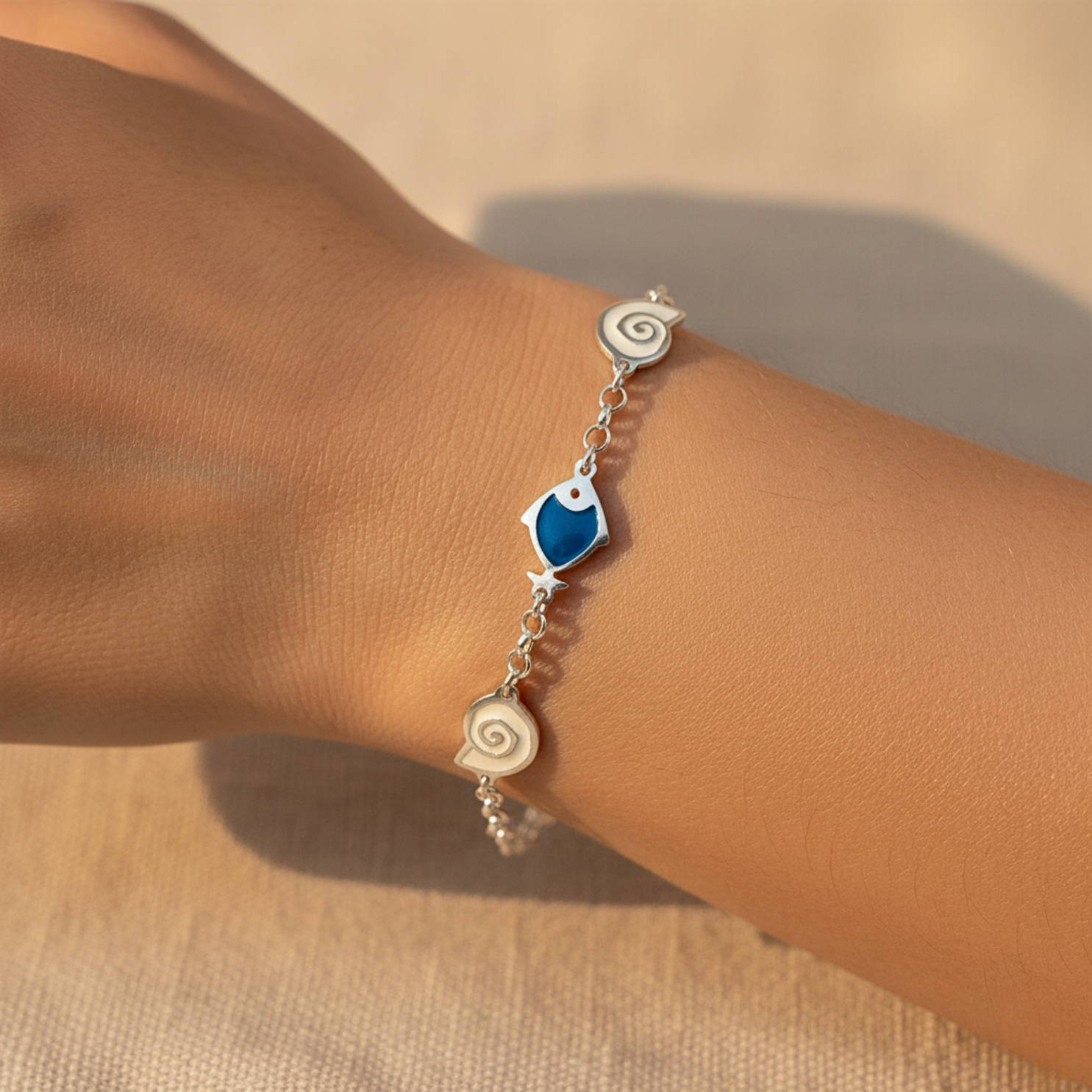 Egy kifinomult részlet, ami különlegessé teszi a megjelenésed. Ez a kézzel készült ezüst karkötő a tenger motívumaiból és színeiből merít inspirációt. Finoman simul a csuklóra, és olyan eleganciát sugároz, ami tökéletesen illik mindennapi vagy alkalmi viselethez.